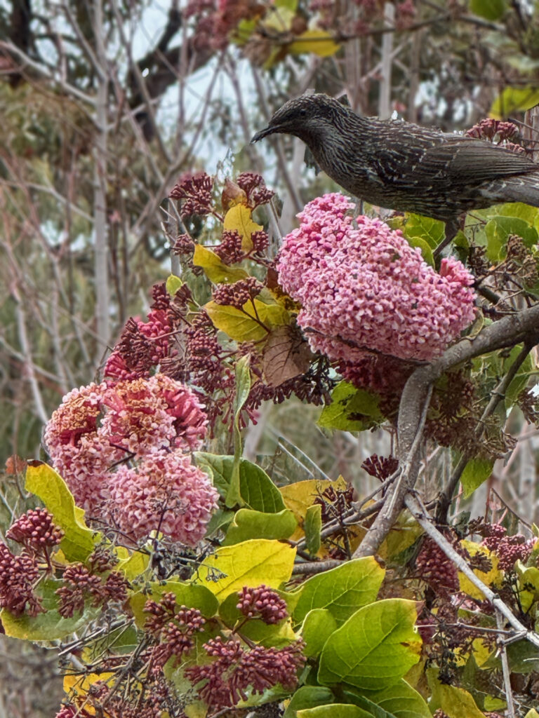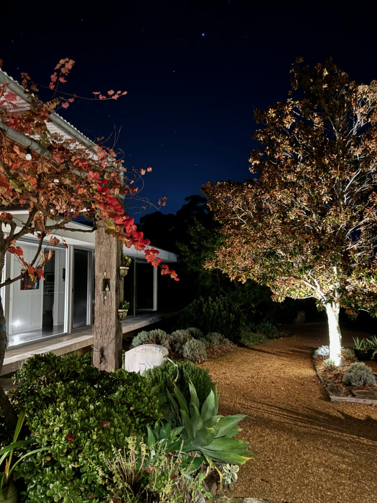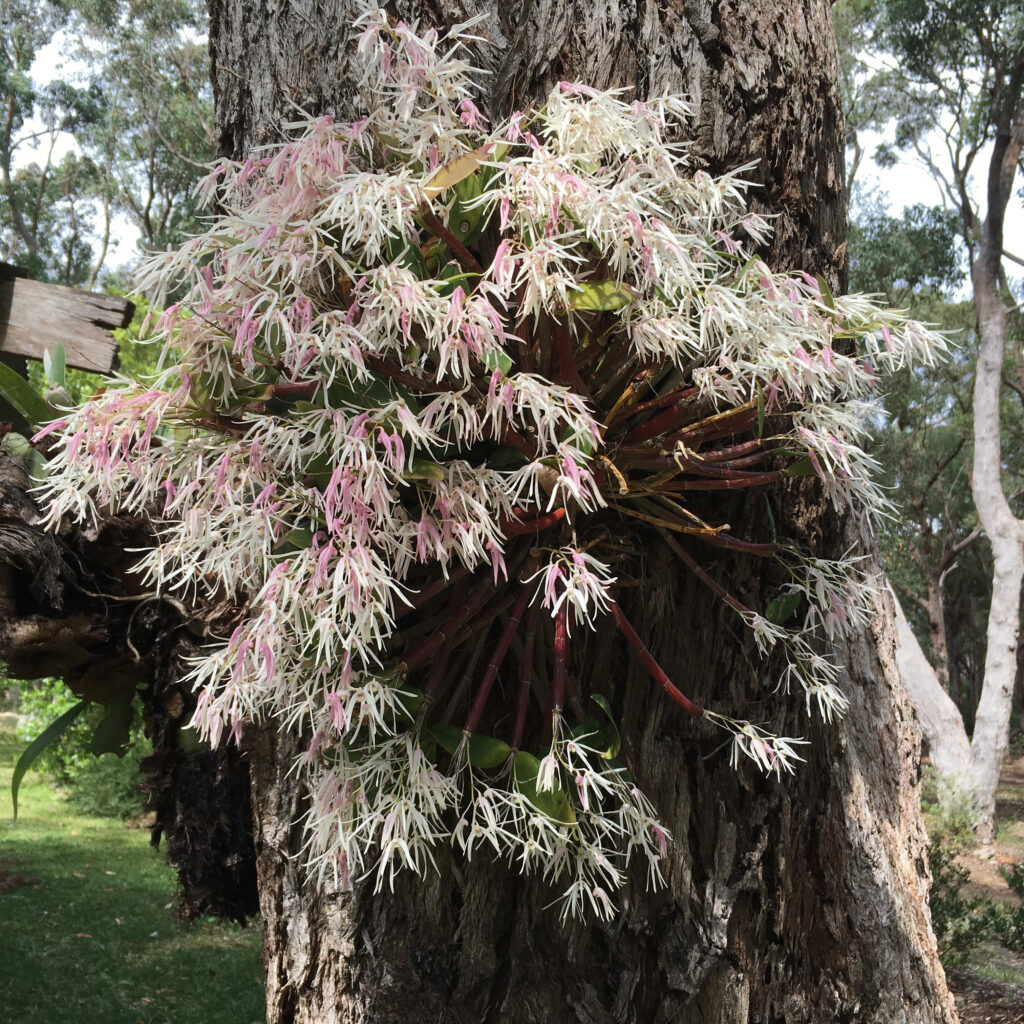 When it is heavily in bloom with yellow flowers, Dirramu’s most spectacular tree is the South American Tipuana tipu. While dozens of large trees fell during a fierce storm in 2015, the Tipuana was slightly luckier when seven main branches became just four. Even so, it remains the broadest spreading tree on the property. At its base, a large bird’s nest fern and a staghorn thrive.
