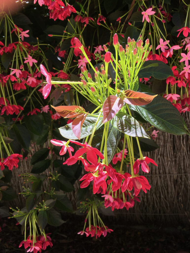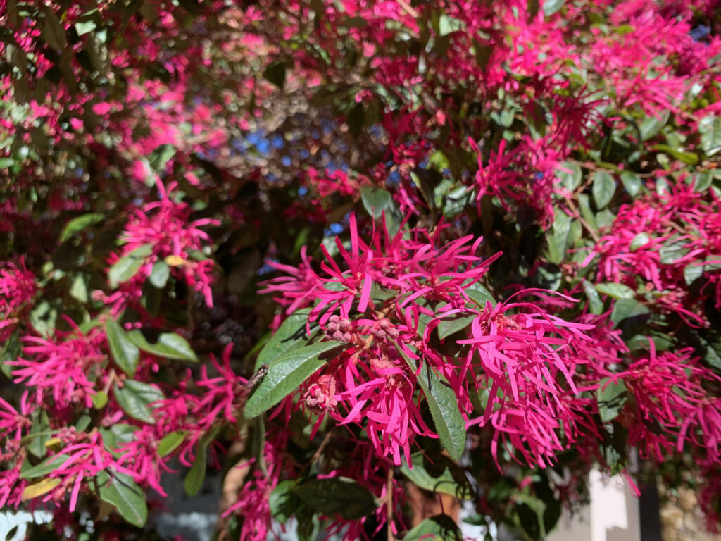 At different times of the year, and at every turn of the pebbled driveway there is something to catch your eye: the blood-dark flowers of Melianthus major against its grey-green foliage and, as the house comes into view, your breath is taken away by the fierce pink flowers of a huge Loropetalum tree.