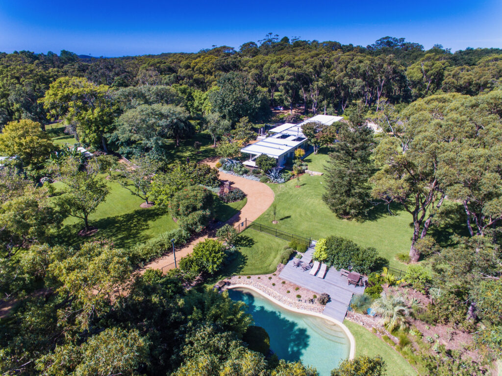 The blooming Gymea lilies would need a Council DA approval if they were any taller. The 20-year-old Canary Island palms and cycads are positively Jurassic. Everything is lush and green.