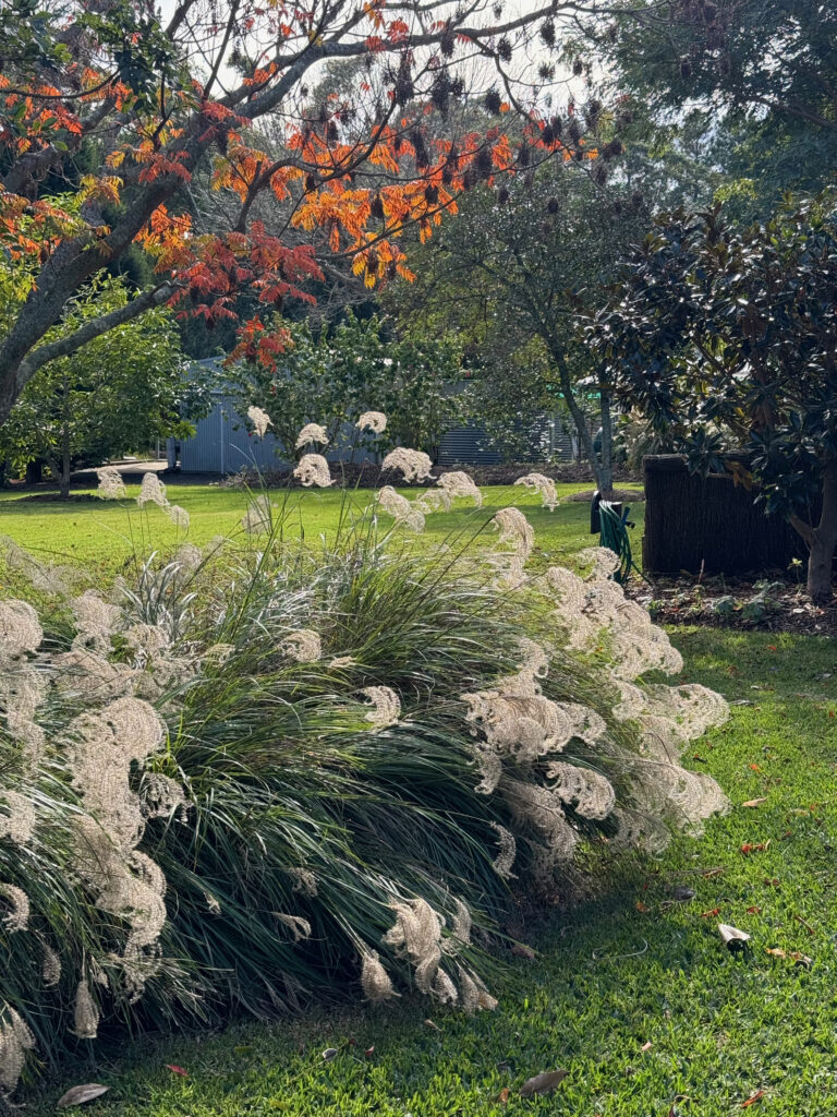 The last impenetrable area of the garden was furthest from the house. It had an old road going through it and housed a mud-brick structure. Today, lawns meander around tall eucalypts, edged by hedges and mounded areas with native grasses that shield the garden from neighbouring properties.