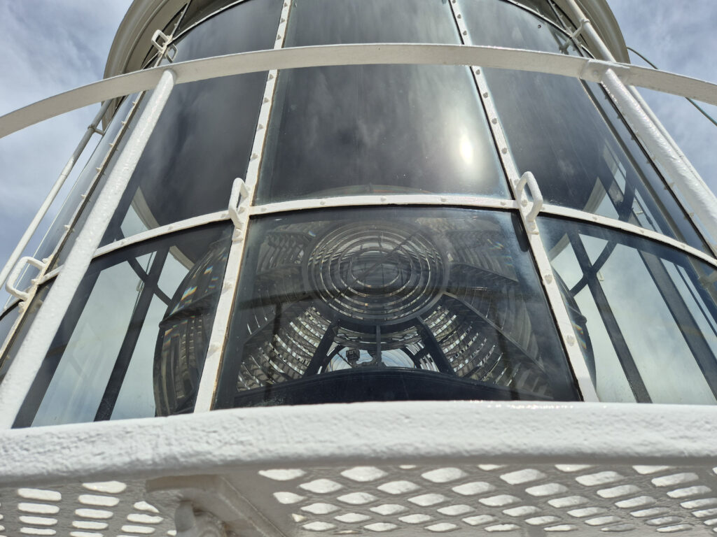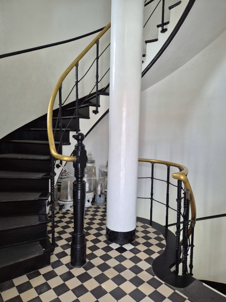 Puffing slightly after climbing the 96 stairs that wind around a central cast-iron pole, we step into the lantern room. In 1903, when the lighthouse opened, a vaporised kerosene lamp provided a light source that was visible up to 18 nautical miles (33 km). Today, the light comes from a 1000W halogen globe.