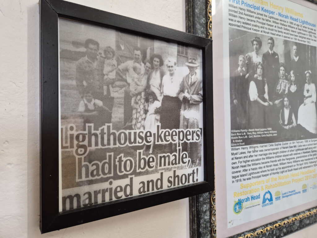 We’re standing in the entrance hall on the ground floor of Norah Head Lighthouse. Etched in the glass of the door is the saying ‘Once perilous now safe.’ Across the hall is a ghost entrance. Southerly winds blasting through made the entry unworkable and it was bricked off.