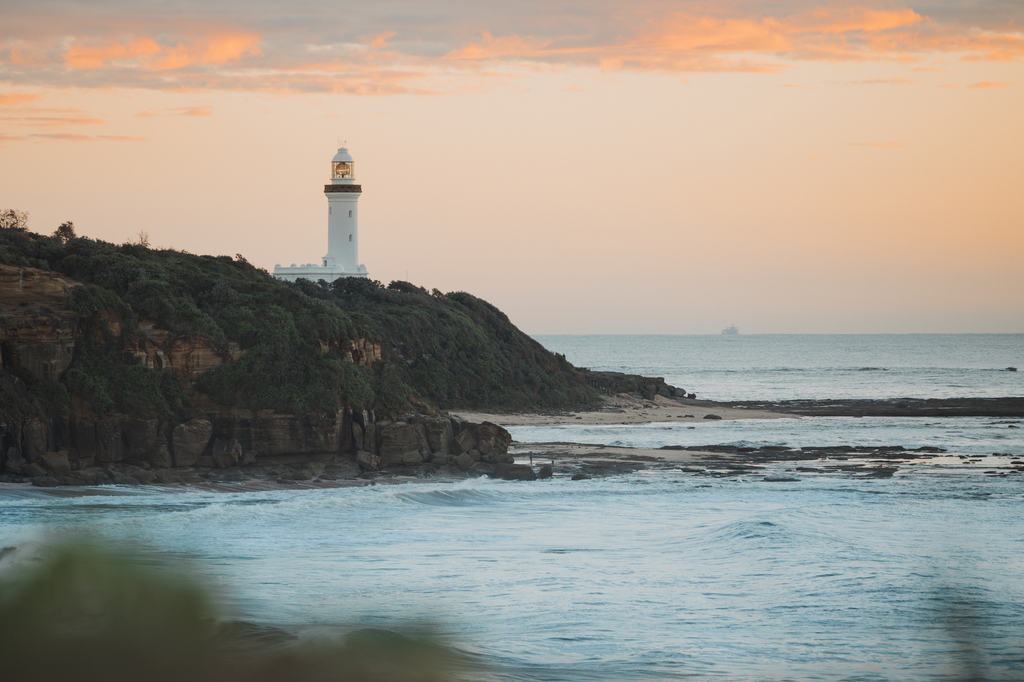Looking north towards Newcastle, beyond the rock platform exposed by the low tide, a white-water wash hints at the treacherous reef below. It was because locals witnessed so many shipwrecks off Norah Head that they petitioned the government to build a lighthouse.