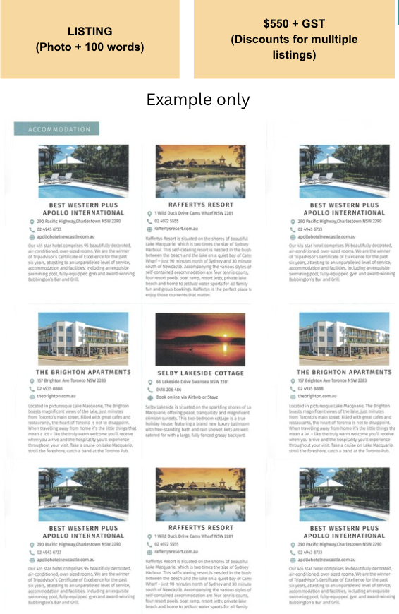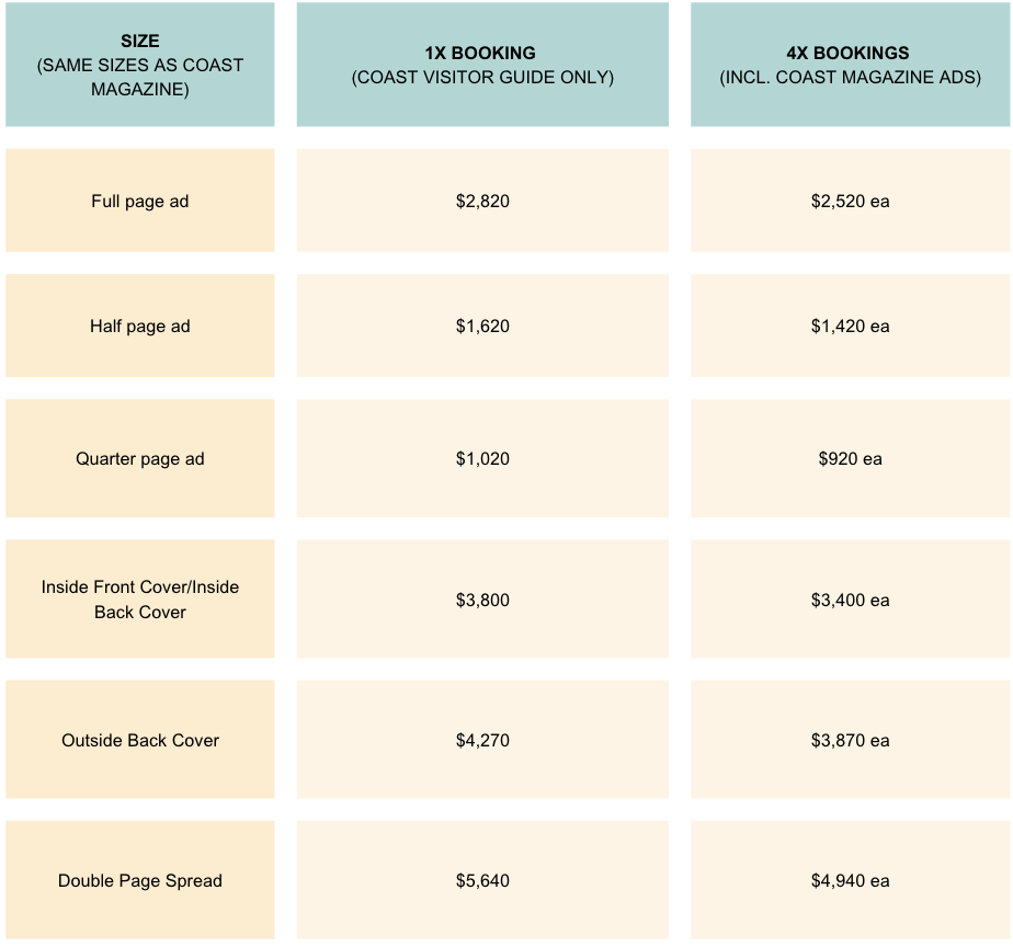 The COAST Visitor Guide is valid for 12 months but we have undertaken to keep the ad rates the same as (the quarterly) COAST magazine: