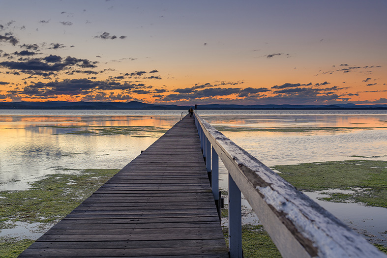 Popular with photographers, the timber jetty that gave Long Jetty its name was built in 1914 to service a private estate. A year later, the jetty was taken over by the then Erina Shire Council, and became a ferry stop for transporting people to and from Wyong. Passengers would wait in a large shed at the end of the jetty, while swimmers dived off platforms. The original jetty was washed away in a flood in 1927 but was rebuilt longer and now extends 351 metres into Tuggerah Lake.